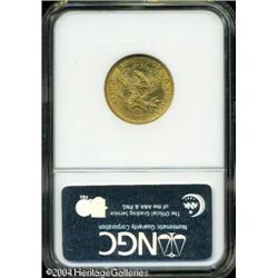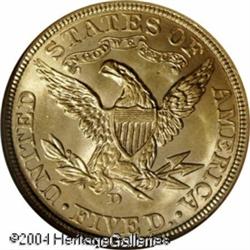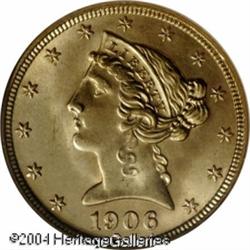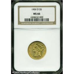 1906-D $5 MS66 NGC. The 1906-D (320,000 pieces pro <B>1906-D $5 MS66 NGC.</B></I> The 1906-D (320,000 pieces produced) is a more difficult issue to locate than the 1907-D. Actually, neither date can realistically be considered rare in an absolute sense, but Gems are elusive. Among the finest certified survivors of the former production, this richly frosted, yellow-gold survivor is free of most distracting abrasions, save for a tiny heart-like void on Liberty's chin. In those areas where it is not sharp, the strike is bold, and the originality of this coin adds to the already long list of positive attributes. Population: 12 in 66, 0 finer (10/04). <BR><BR><B>Important notice:</B> Heritage usually auctions material at the rate of 200-250 lots per hour. On some occasions eBay Live bid software or the Internet may not be able to keep up with the pace of the auction. We recommend placing a realistic absentee bid now as insurance to avoid disappointment. Occasionally the auctioneer may eliminate or reject an eBay Live bid, and the auctioneer may also reopen a lot after the close of the eBay live bidding (usually because we missed an audience bid), and may reject your bid even if it shows you as the winning bidder. By bidding via eBay Live, you agree that Heritage may award the lot to another bidder at its sole discretion under the circumstances described above or any other reasonable circumstances. Since eBay bids are not shown to us until we open the lot on the floor, we treat those bids just like floor bids. In most cases the floor responds before the eBay bid is presented to us, due to Internet lag time, so for consistency we have made it a policy that floor bids are always considered first over tie eBay live bids. Also please note that all Heritage lots purchased through eBay Live carry a 20% Buyer's Premium. Please make sure you read the Terms and Conditions before you bid. This lot is being auctioned in conjunction with a live floor auction by Heritage Galleries & Auctioneers. All final auction and invoice information will be supplied by Heritage Galleries & Auctioneers, and all other information should be considered preliminary. Lot:6689