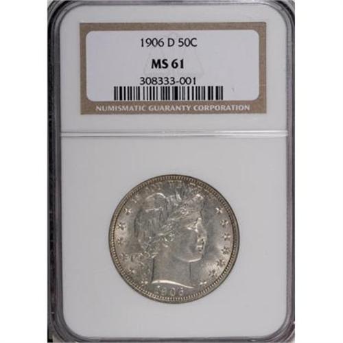 <B>1906-D 50C MS61 NGC.</B></I> An unworn, softly lustrous representative of this first-year D-mint half dollar, well-defined with hints of tan-orange at the margins and silver-gray at the centers. Numerous wispy abrasions appear on the portrait.<BR><BR><B>Coin Engraver:</B> Charles E. Barber<BR><BR><b>Shipping:</b> Coins & Currency (<a target="_blank" href="http://www.heritageauctions.com/common/shipping.php">view shipping information</a>)