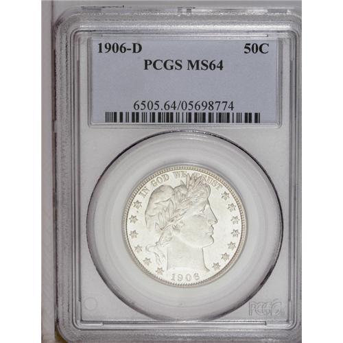 <B>1906-D<50C> MS64 PCGS.</B></I> From the first half dollar issue produced at the Denver Mint, the present example is virtually untoned with no more than the expected number of small abrasions for the grade, most of which are located on the obverse. Both sides are frosty in texture with glassy, semi-prooflike fields and an above-average strike for the type. Population: 42 in 64, 20 finer (1/06).