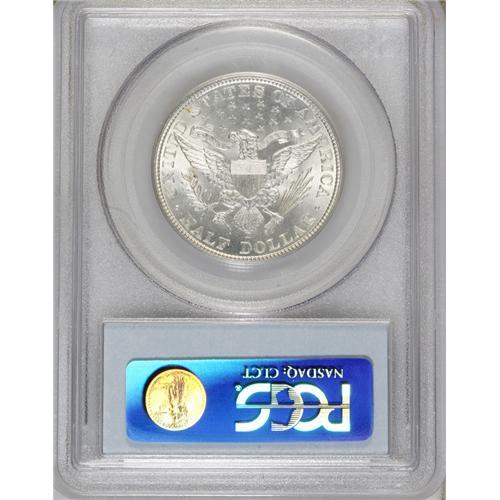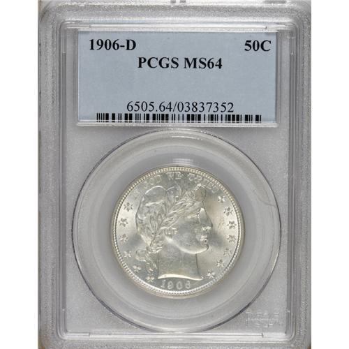 <B>1906-D 50C MS64 PCGS.</B></I> One of just over 4 million Barber halves struck in the first year of the Denver Mint. Strongly lustrous and untoned aside from a patch of tan-gray toning in front of Liberty's forehead. Minor grazes preclude Gem status. Population: 46 in 64, 22 finer (3/07).<BR><BR><b>Shipping:</b> Coins & Currency (<a target="_blank" href="http://www.heritageauctions.com/common/shipping.php">view shipping information</a>)