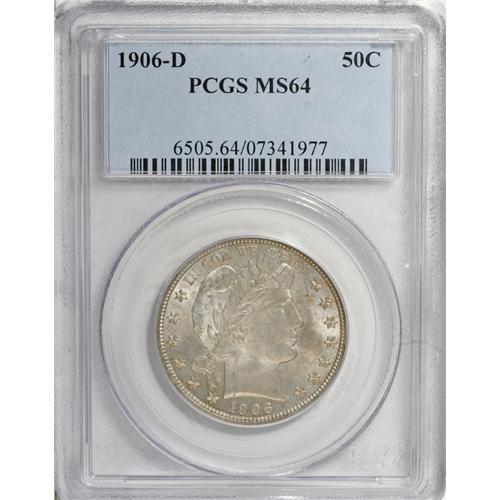 <B>1906-D 50C MS64 PCGS.</B></I> Subtly lustrous with delicate lavender and rose-gold patina. The devices display suitable detail and only a handful of marks, none of them distracting. Population: 45 in 64, 22 finer (11/06).<BR><BR><b>Shipping:</b> Coin/Currency (<a target="_blank" href="http://www.heritageauctions.com/common/shipping.php">view shipping information</a>)