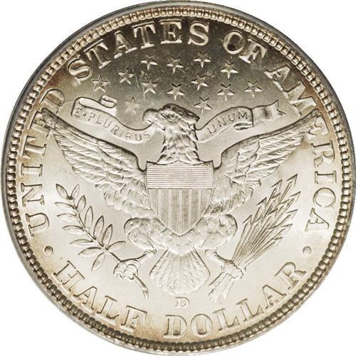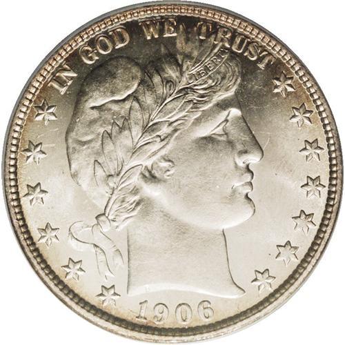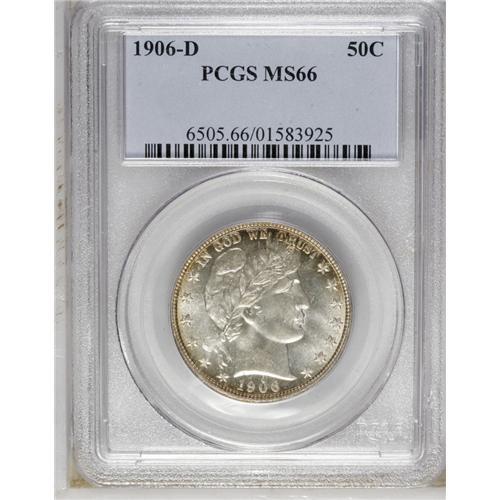 <B>1906-D 50C MS66 PCGS.</B></I> Lemon-gold toning endows the borders, although the remainder of this lustrous high grade example is brilliant. The strike is bold save for the upper left edge of the right (facing) wing. Despite a plentiful mintage, the first-year Denver Mint half becomes rare at the MS66 level. Population: 7 in 66, 1 finer (10/06).<BR><BR><b>Shipping:</b> Coin/Currency (<a target="_blank" href="http://www.heritageauctions.com/common/shipping.php">view shipping information</a>)
