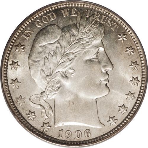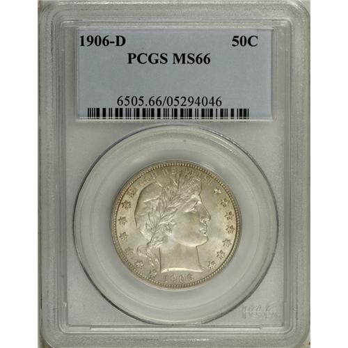 <B>1906-D 50C MS66 PCGS.</B></I> Lightly gold-toned overall with orange patina near the rims. A few grazes appear at the point of the bust and elsewhere on the obverse, but the luster and strike are pleasing, and such minor flaws are forgivable. One of 4,028,000 pieces produced in the first year of the Denver Mint. Population: 7 in 66, 1 finer (12/06).<BR><BR><b>Shipping:</b> Coin/Currency (<a target="_blank" href="http://www.heritageauctions.com/common/shipping.php">view shipping information</a>)