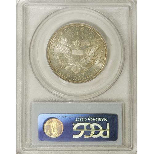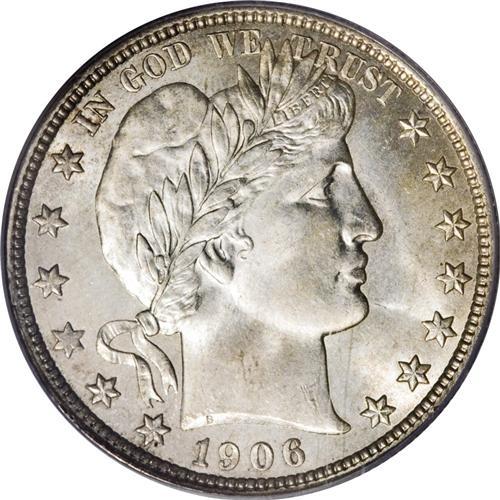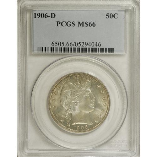 <B>1906-D 50C MS66 PCGS.</B></I> Lightly gold-toned overall with speckled russet patina near the rims. A few grazes appear at the point of the bust and elsewhere on the obverse, but the luster and strike are pleasing, and such minor flaws are forgivable. One of 4,028,000 pieces produced in the first year of the Denver Mint. Population: 7 in 66, 1 finer (2/07).<BR><BR><b>Shipping:</b> Coins & Currency (<a target="_blank" href="http://www.heritageauctions.com/common/shipping.php">view shipping information</a>)