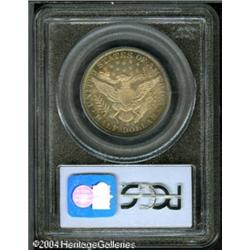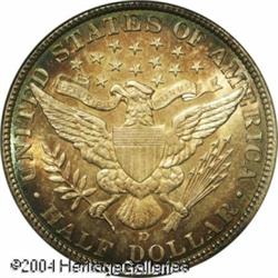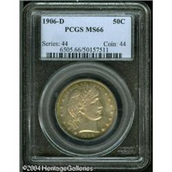 1906-D 50C MS66 PCGS. The premier Barber Half Doll <B>1906-D 50C MS66 PCGS.</B></I> The premier Barber Half Dollar produced in the Denver Mint, the 1906-D, with a respectable total of 4 million coins struck, is a common coin in an absolute sense. On the other hand, few people seem to have bothered saving a pristine example, and this issue is now recognized as scarce to rare in all Mint State grades. This is a beautiful coin from the standpoint of both surface preservation and originality. Bountiful mint frost shimmers beneath warm apricot-gold and olive-gray toning that yields to electric-blue and mint-green shades in most areas around the peripheries. Sharply struck, save for weakness on obverse star 3 and on the eagle's right (facing) claw, and expectantly abrasion-free for the desirable MS66 level of preservation. Population: 6 in 66, 1 finer (10/04). <BR><BR><B>Important notice:</B> Heritage usually auctions material at the rate of 200-250 lots per hour. On some occasions eBay Live bid software or the Internet may not be able to keep up with the pace of the auction. We recommend placing a realistic absentee bid now as insurance to avoid disappointment. Occasionally the auctioneer may eliminate or reject an eBay Live bid, and the auctioneer may also reopen a lot after the close of the eBay live bidding (usually because we missed an audience bid), and may reject your bid even if it shows you as the winning bidder. By bidding via eBay Live, you agree that Heritage may award the lot to another bidder at its sole discretion under the circumstances described above or any other reasonable circumstances. Since eBay bids are not shown to us until we open the lot on the floor, we treat those bids just like floor bids. In most cases the floor responds before the eBay bid is presented to us, due to Internet lag time, so for consistency we have made it a policy that floor bids are always considered first over tie eBay live bids. Also please note that all Heritage lots purchased through eBay Live carry a 20% Buyer's Premium. Please make sure you read the Terms and Conditions before you bid. This lot is being auctioned in conjunction with a live floor auction by Heritage Galleries & Auctioneers. All final auction and invoice information will be supplied by Heritage Galleries & Auctioneers, and all other information should be considered preliminary. Lot:6128