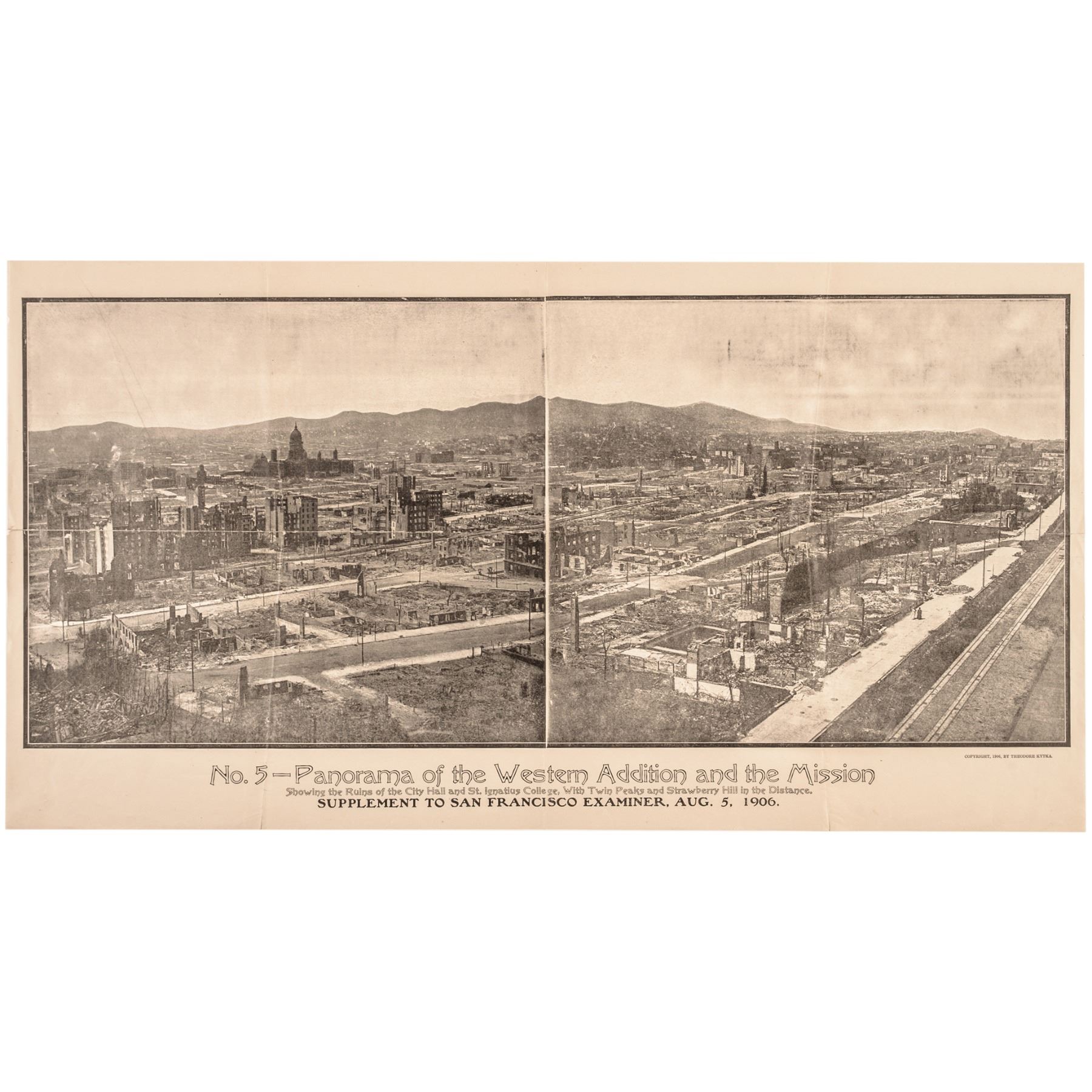 Original Complete Set of Five Panoramic Prints depicting the aftermath of the 1906 San Francisco Earthquake. This remarkable historic Set was published as a supplement to the San Francisco Examiner newspaper over the course of five weeks in July, 1906. The massive earthquake, which occurred on April 18, 1906, is still considered one of the greatest natural disasters in the history of the United States, and ranks second in number of lives lost in a natural disaster in the U.S.