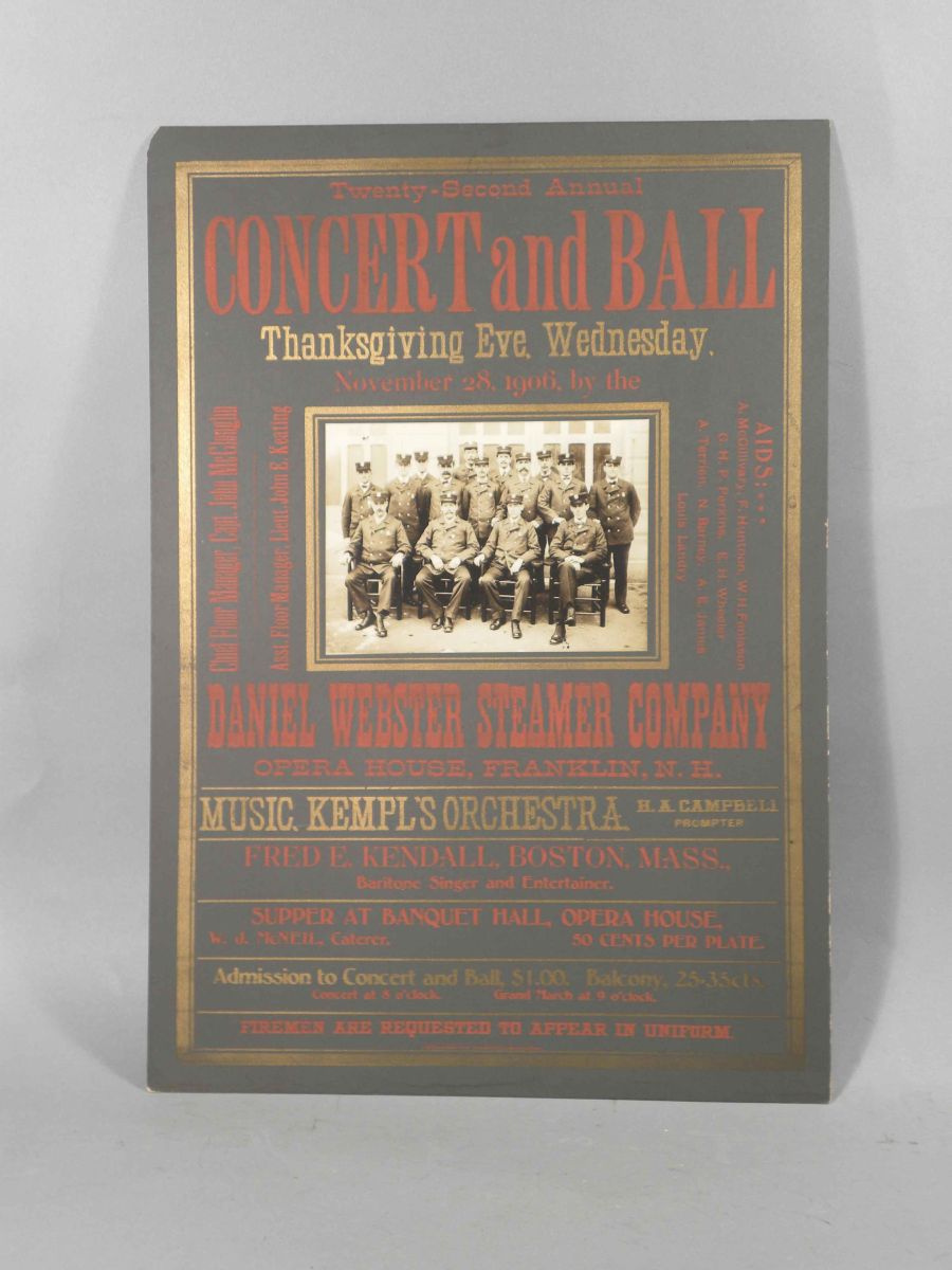 Cardboard Poster for Daniel Webster Steamer Company Franklin, NH. 22nd Annual Fireman's Concert and Ball, Thanksgiving Eve. November 28, 1906. One corner slightly torn otherwise good condition. 14 X 20 inches.