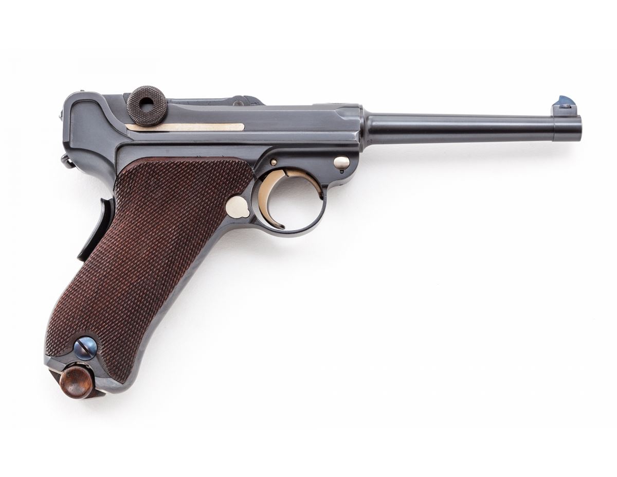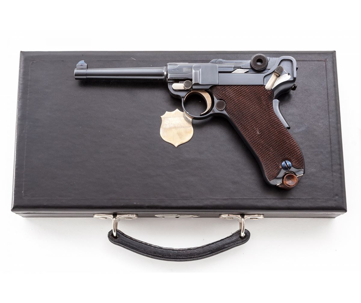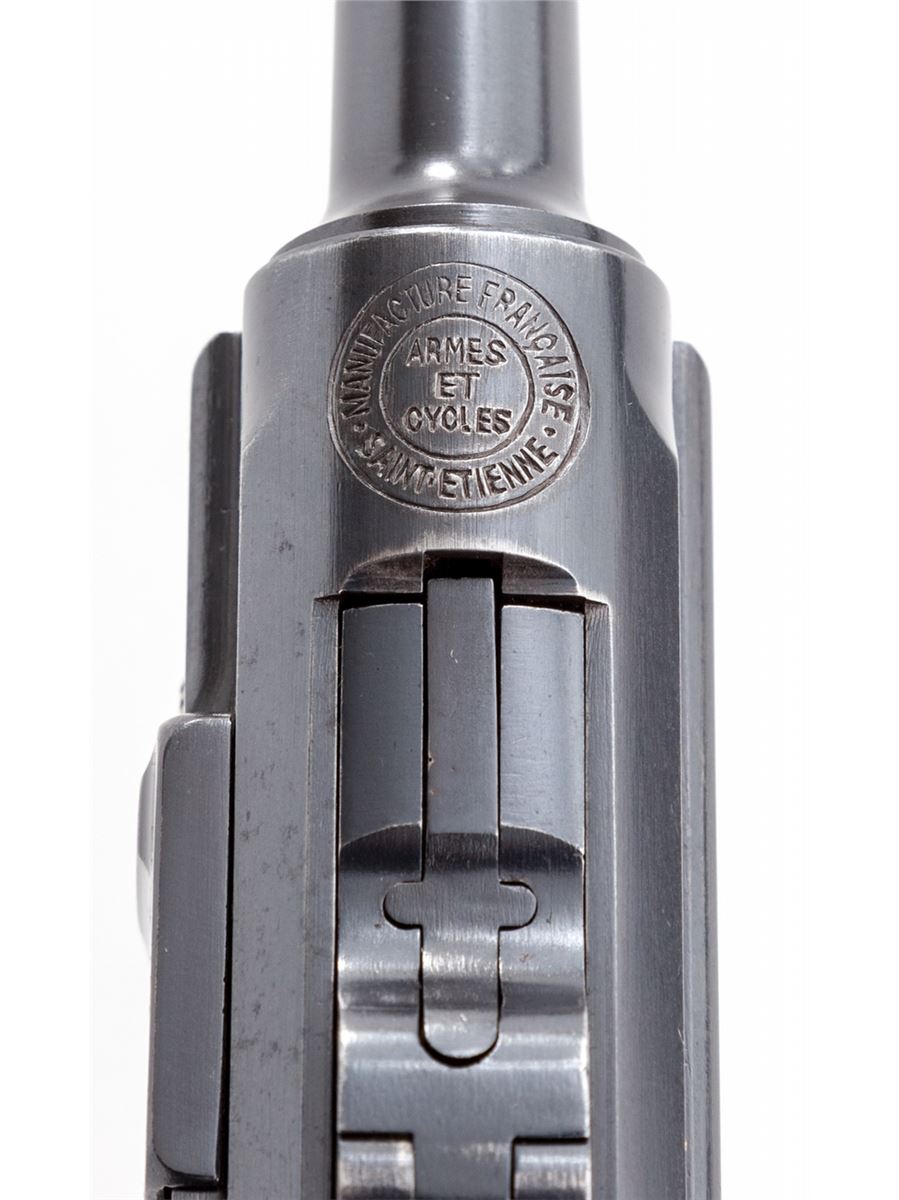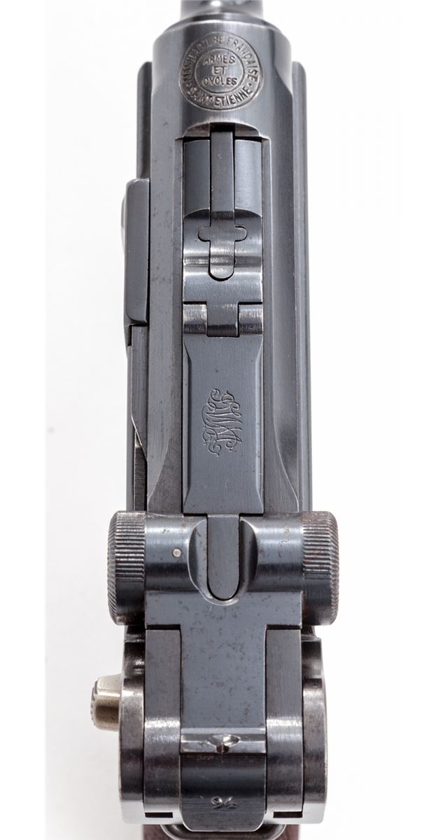 1906 French marked Commercial Luger, #28594, .30 Luger cal., 4-3/4'' barrel, blue finish with straw small parts, factory checkered walnut grips, and one unmarked nickel-plated magazine with walnut base. In modern-made black leather case with green felt lining. Circular logo to chamber area marked ''Manufacture Francaise-St. Etienne/Armes et Cycles''; DWM marked toggle link, lower safety area polished bright, extractor marked ''Chargez'', BUG proofmarks, and interestingly not marked lengthwise to top of barrel but logo to chamber area in circular donut style. Condition is excellent as professionally refinished, with thinning to serial numbers, commercial proofmarks, and DWM logo. French markings appear to be crisp and marked through the existing finish. Grips and action are crisp, bore is about good with moderate frosting in the grooves. Case is excellent. Est.: $3,500-$5,000. (C&R/PPT) (John Siroonian estate)