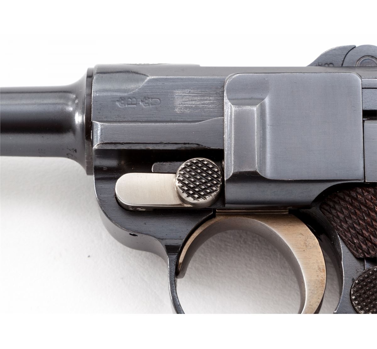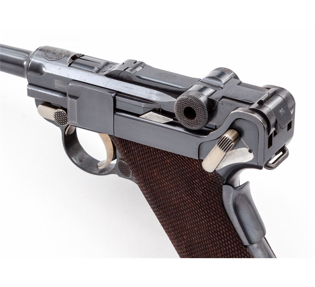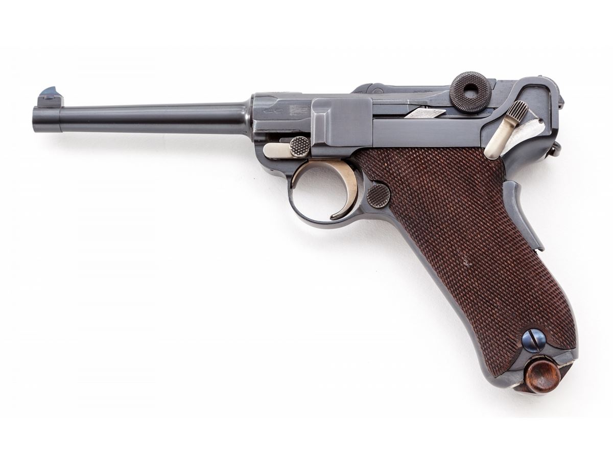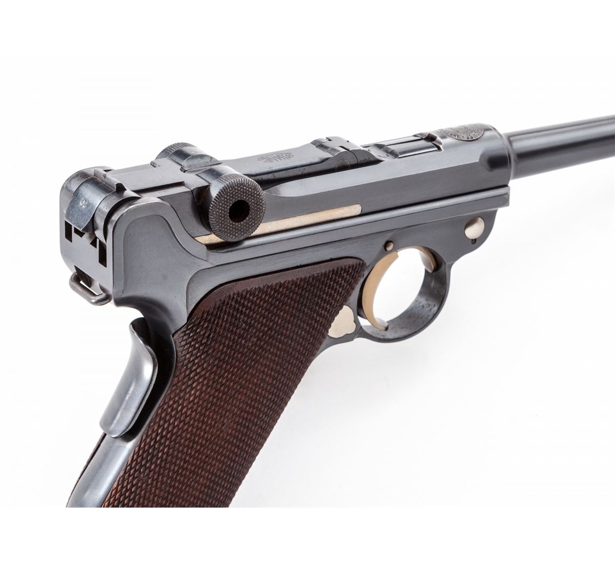 1906 French marked Commercial Luger, #28594, .30 Luger cal., 4-3/4'' barrel, blue finish with straw small parts, factory checkered walnut grips, and one unmarked nickel-plated magazine with walnut base. In modern-made black leather case with green felt lining. Circular logo to chamber area marked ''Manufacture Francaise-St. Etienne/Armes et Cycles''; DWM marked toggle link, lower safety area polished bright, extractor marked ''Chargez'', BUG proofmarks, and interestingly not marked lengthwise to top of barrel but logo to chamber area in circular donut style. Condition is excellent as professionally refinished, with thinning to serial numbers, commercial proofmarks, and DWM logo. French markings appear to be crisp and marked through the existing finish. Grips and action are crisp, bore is about good with moderate frosting in the grooves. Case is excellent. Est.: $3,500-$5,000. (C&R/PPT) (John Siroonian estate)