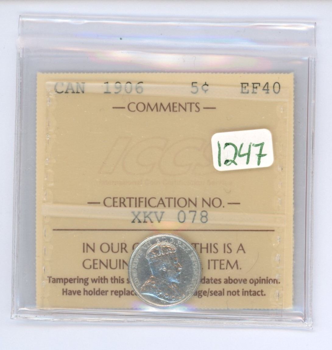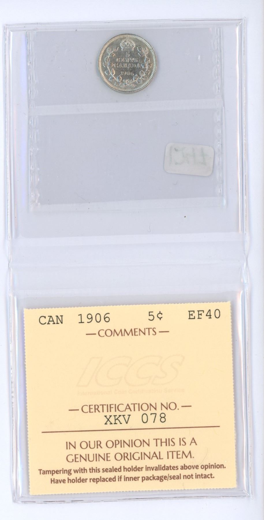 1906 ICCS graded, Canadian silver 5 cent coin - EF40
