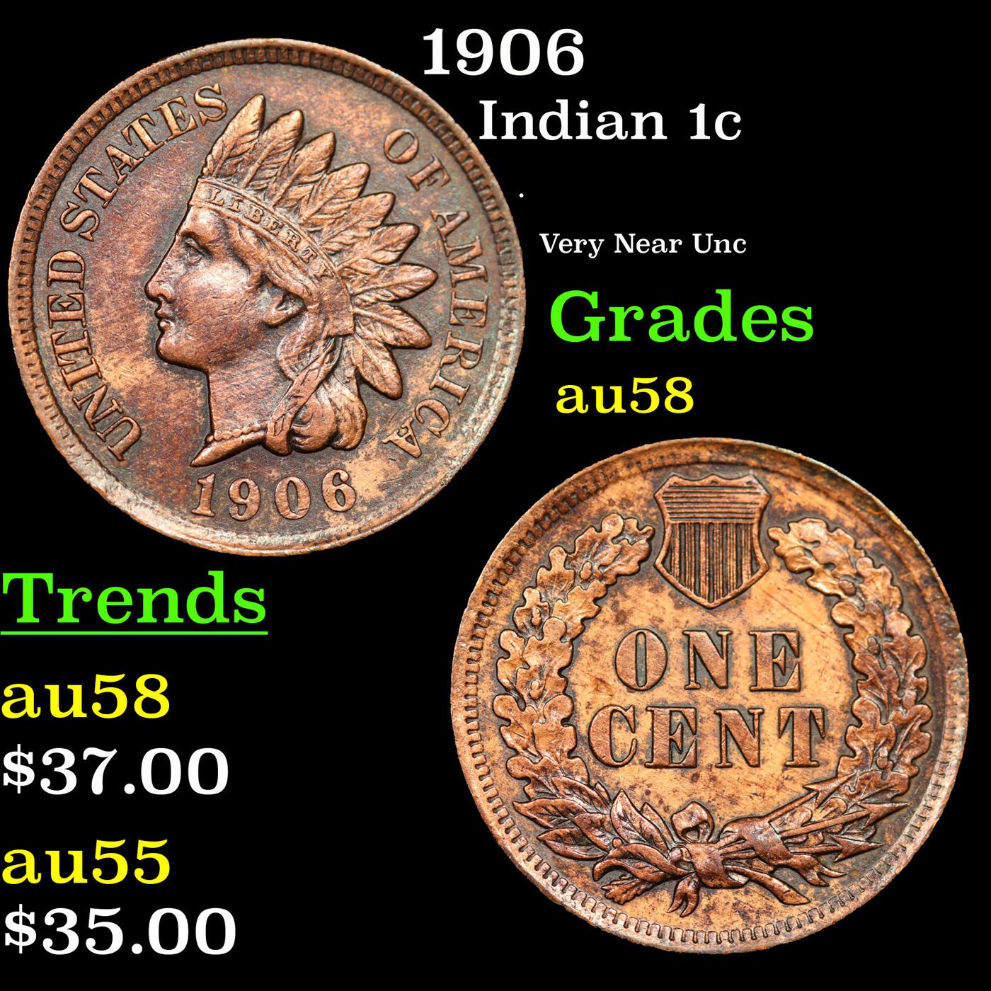 1906 Indian Cent 1c Grades Choice AU/BU Slider.