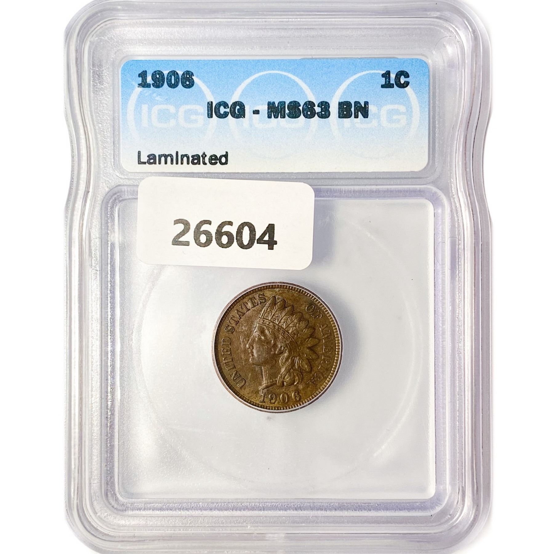 1906 Indian Head Cent ICG MS63 BN, Laminated