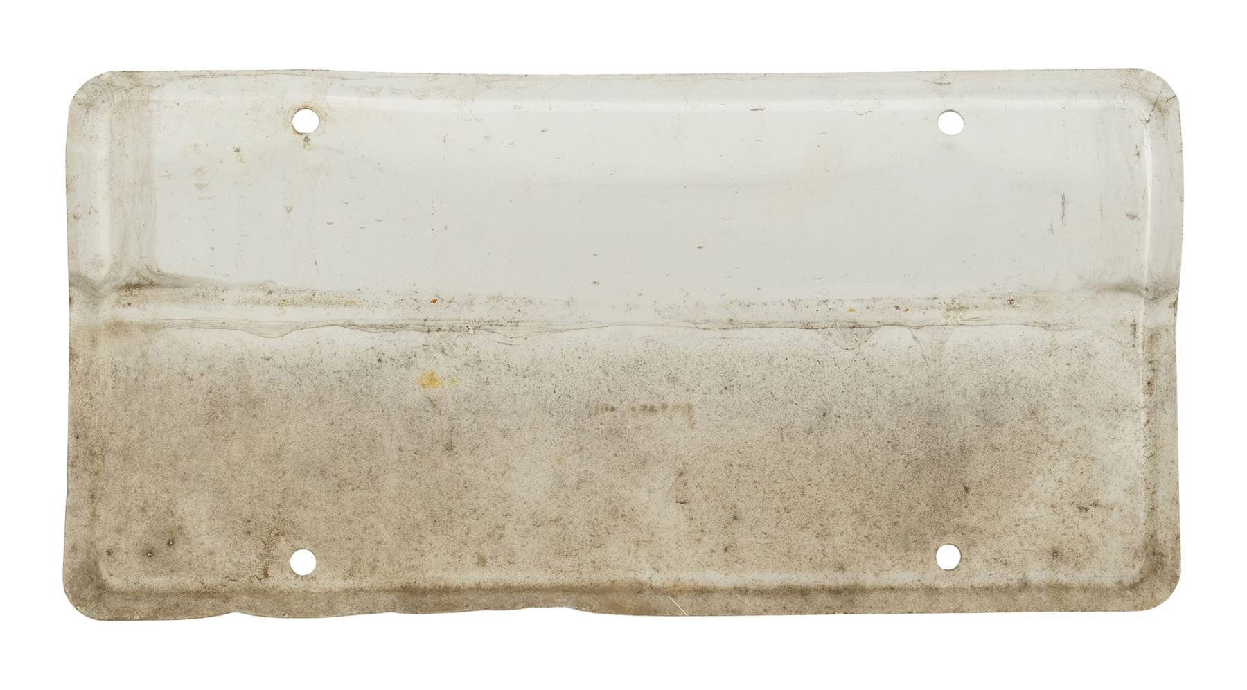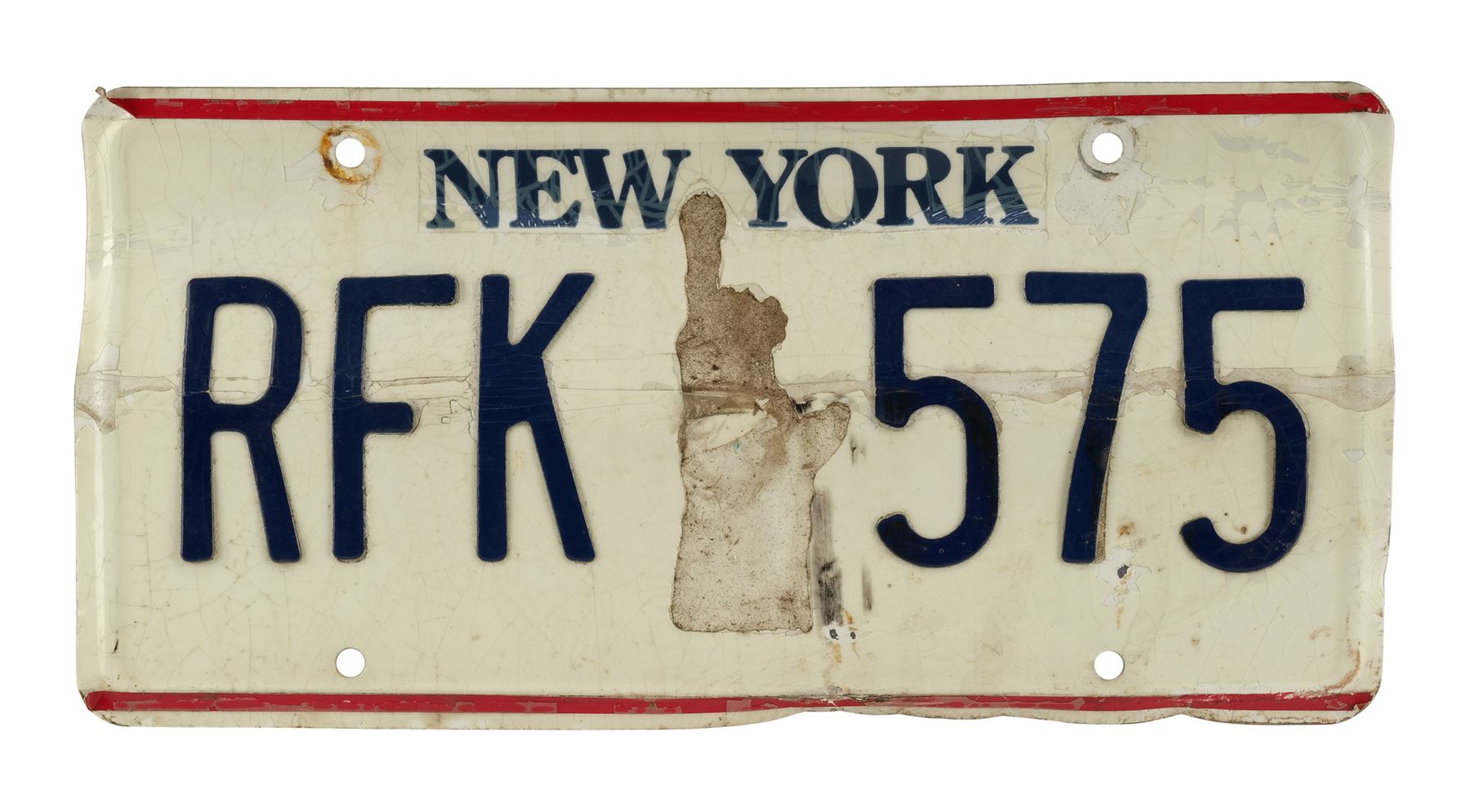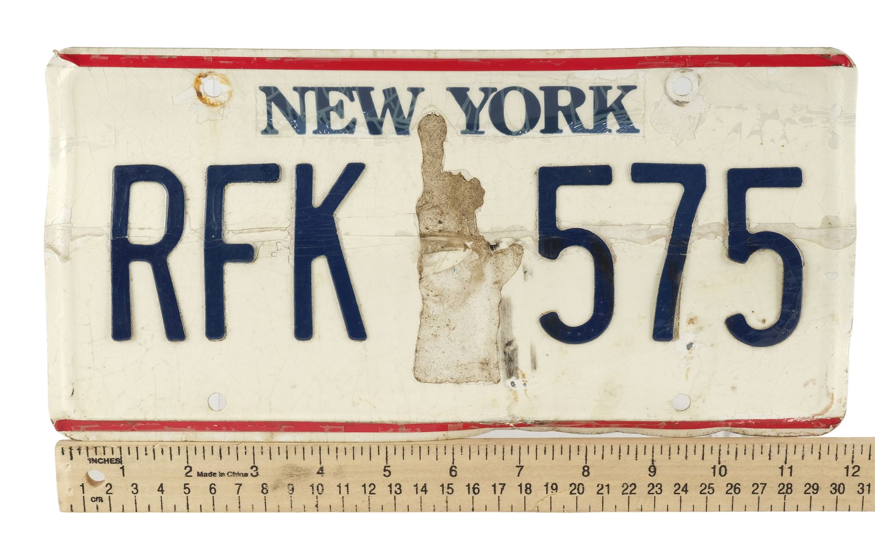 This lot consists of a white painted metal New York license plate "RFK575" in blue vinyl. This lot exhibits peeling vinyl, a missing Statue of Liberty graphic, bending, tarnishing, and production-added speckling to resemble grime. Dimensions: 12" x 6" x 0.25" (30.5 cm x 15.25 cm x 0.75 cm)