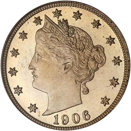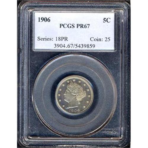 <b>1906 Liberty Nickel. PCGS graded Proof 67.</b> A rollicking-fresh gem Proof. Graceful underlying mirrors support sleek and bold devices here. A pleasing example of the date, no, make that a gorgeous example of the date, ever so fully struck, with detail in the head and wreath area that shows no compromises. Proof mintage was only 1,725 pieces <b>(PCGS # 3904)</b>