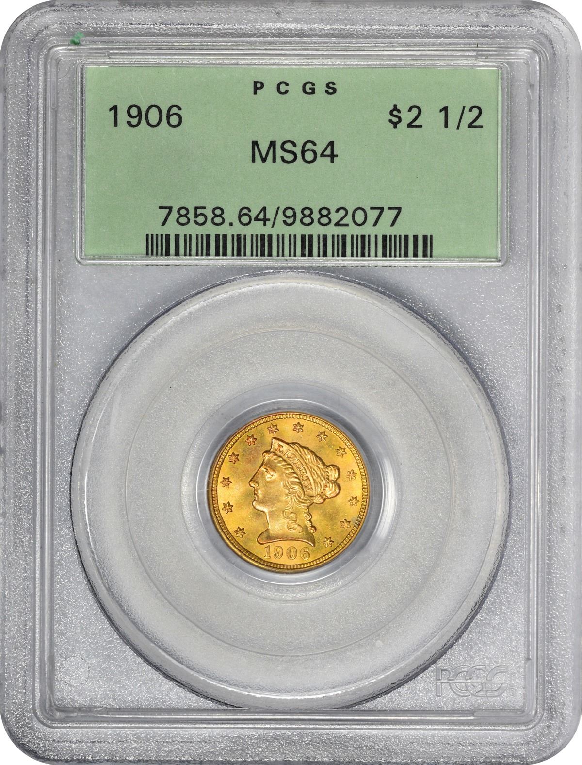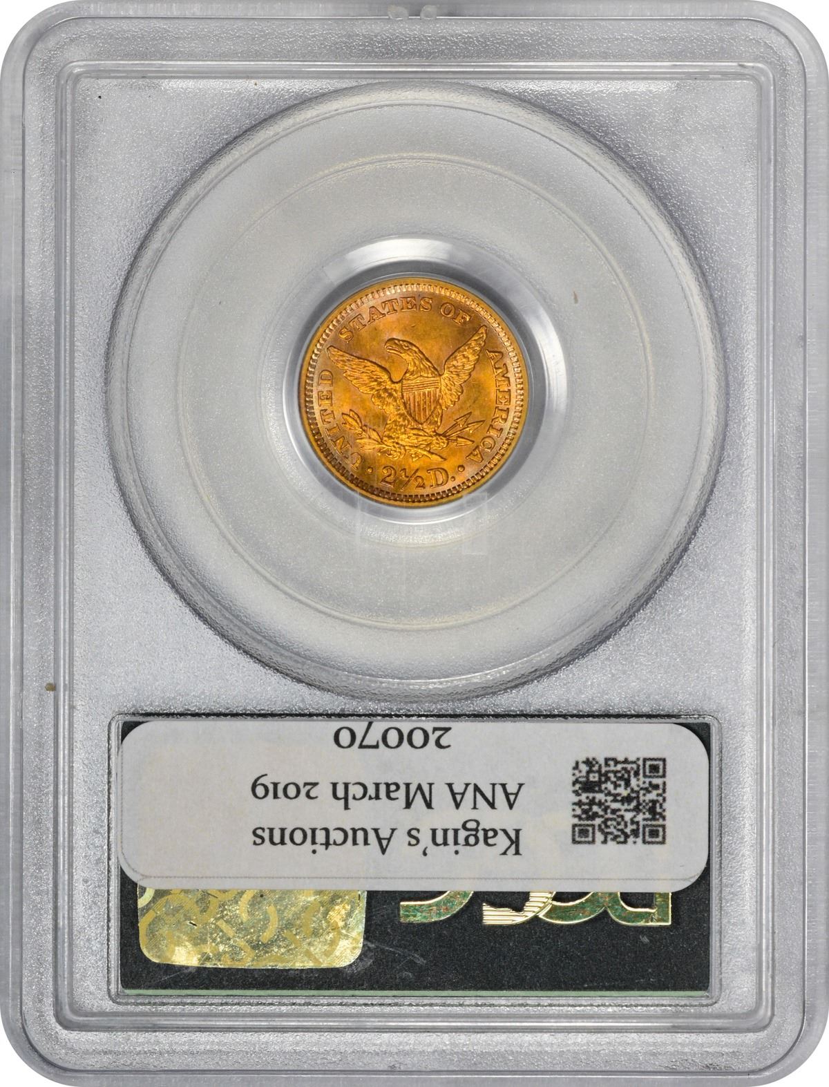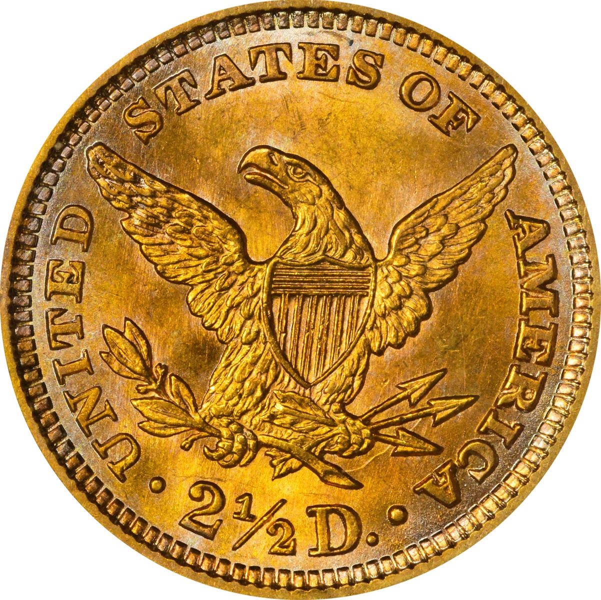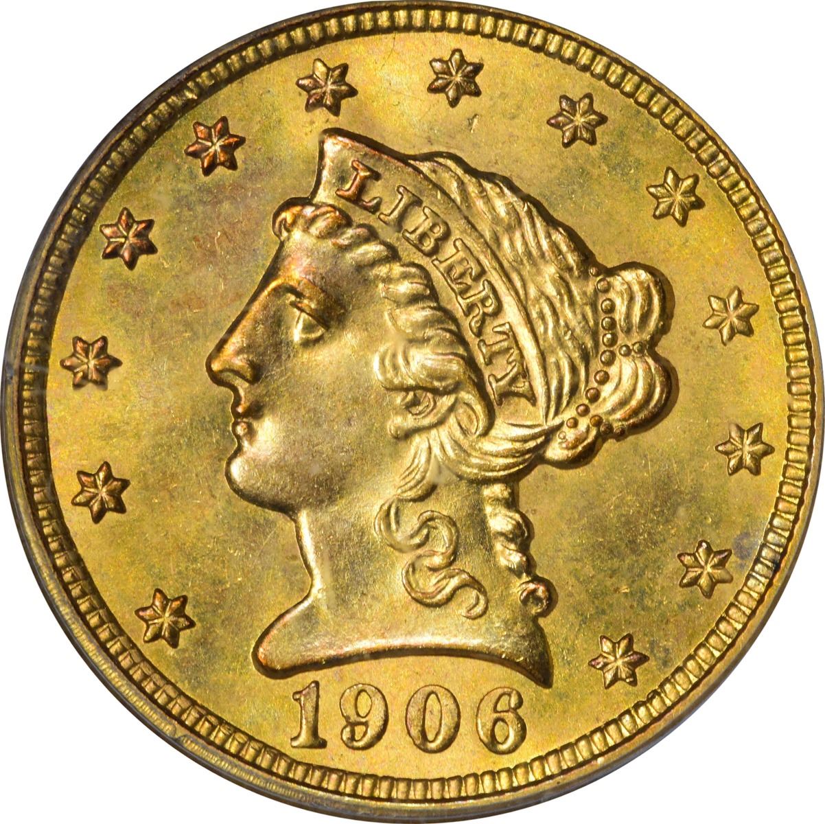 The obverse of this brightly lustrous honey-gold quarter eagle enjoys pale sky-blue and peach iridescence toward the rim, while the reverse is a study in bright rose-orange and pale blue toning. The strike is needle-sharp and the eye appeal immediately suggests a higher grade. Choice for the date, grade, and type. Housed in an older-style PCGS holder with green label and frame around holder. PCGS #7858