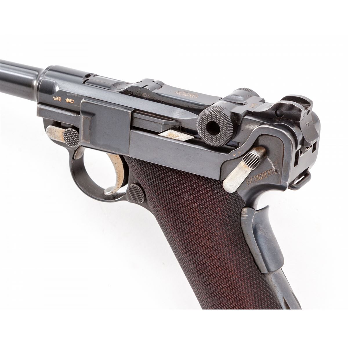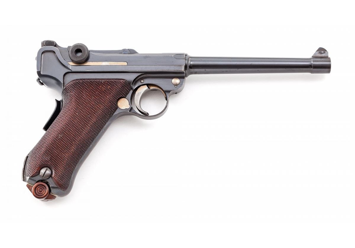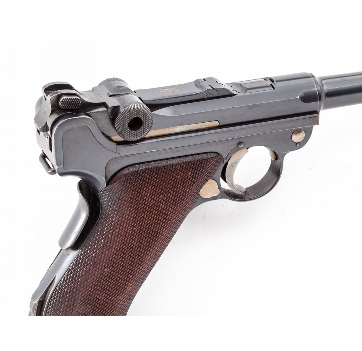 1906 Navy Commercial Luger, #47278, 9mm, 6'' barrel, blue finish with straw small parts, factory checkered walnut grips, with one nickel-plated wood based magazine marked ''CAL 9M/M''. Considered somewhat rare with just 3000 produced. Blank marked chamber, DWM marked toggle, BUG proofmarks, thumb safety with ''Gesichert'' in the lower position (unlike standard Lugers where ''Safe'' is in the upper position). Condition is excellent retaining approx. 96% lightly thinning and toning blue, with slight areas of possible touchup to rear portion of frame. Straw parts retains approx. 70% vivid hues with most of the losses to right side of trigger and body of thumb safety. Grips with mild flattening. Action is good, bore is fine. All visible matching numbers. A seldom seen variation. Est.: $6,000-$8,000. (C&R/PPT) (John Siroonian estate)
