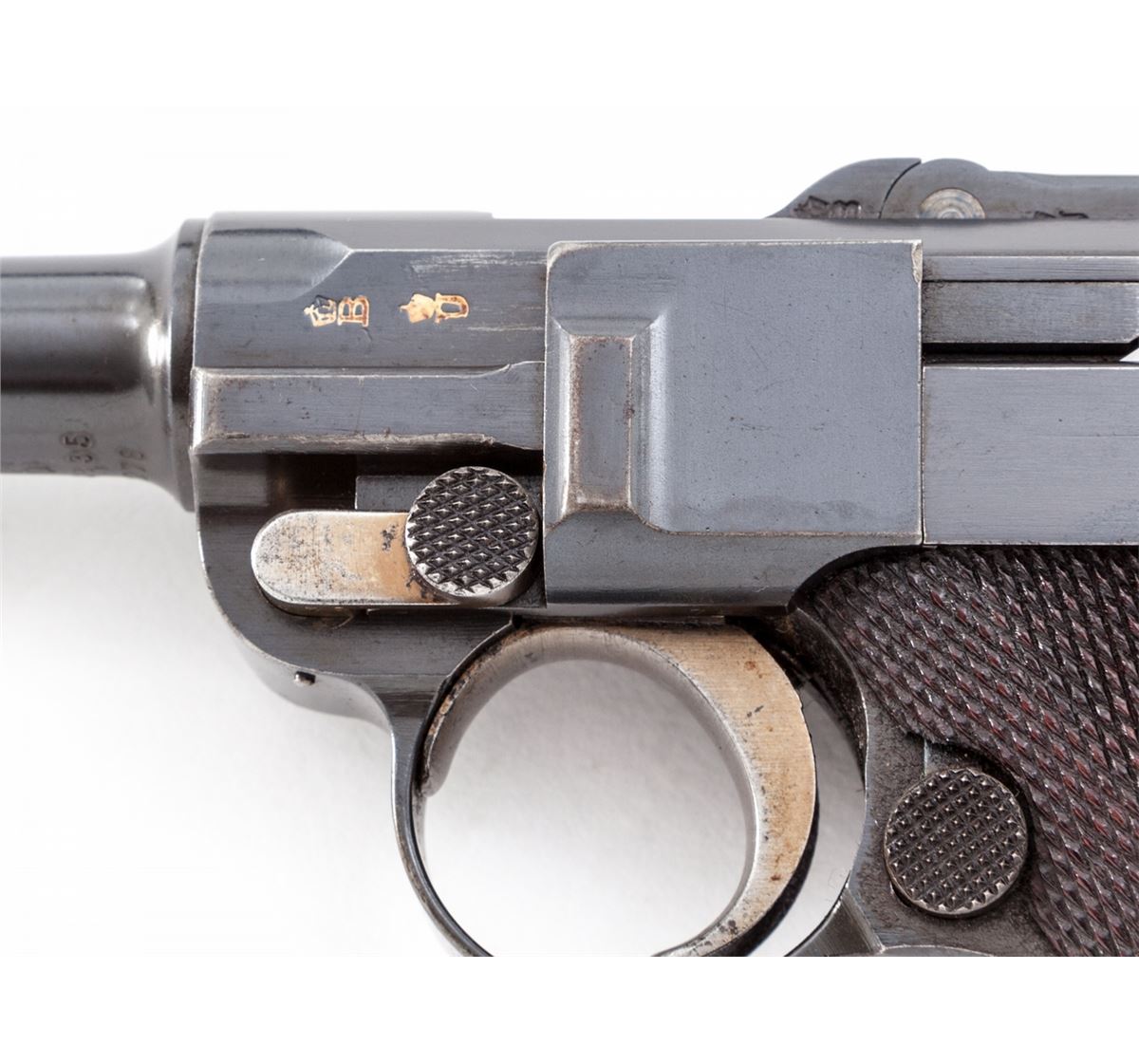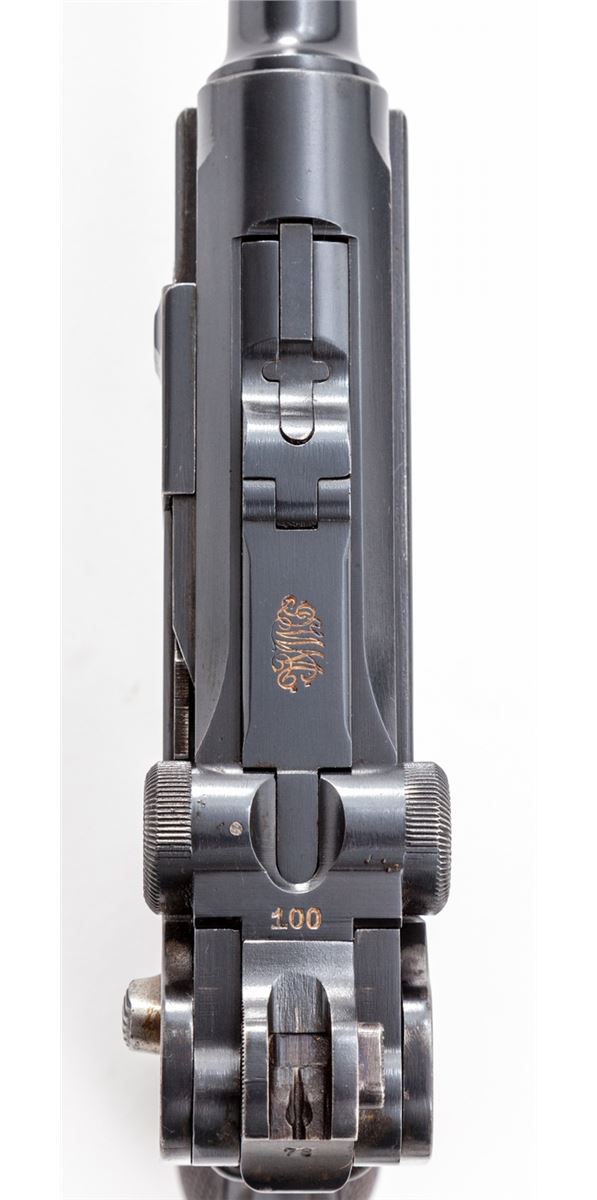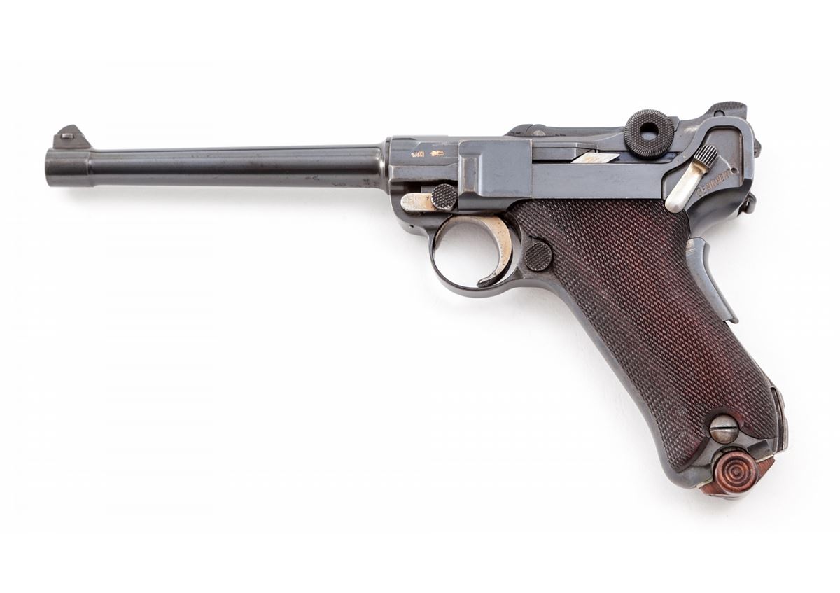 1906 Navy Commercial Luger, #47278, 9mm, 6'' barrel, blue finish with straw small parts, factory checkered walnut grips, with one nickel-plated wood based magazine marked ''CAL 9M/M''. Considered somewhat rare with just 3000 produced. Blank marked chamber, DWM marked toggle, BUG proofmarks, thumb safety with ''Gesichert'' in the lower position (unlike standard Lugers where ''Safe'' is in the upper position). Condition is excellent retaining approx. 96% lightly thinning and toning blue, with slight areas of possible touchup to rear portion of frame. Straw parts retains approx. 70% vivid hues with most of the losses to right side of trigger and body of thumb safety. Grips with mild flattening. Action is good, bore is fine. All visible matching numbers. A seldom seen variation. Est.: $6,000-$8,000. (C&R/PPT) (John Siroonian estate)