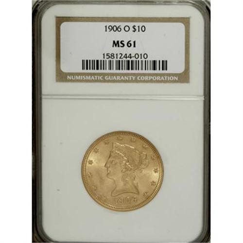 <B>1906-O $10 MS61 NGC.</B></I> The 1906-O is the final New Orleans ten dollar issue, although its final gold emission, the 1909-O five, waited until the closing year of the Southern facility. This is a lustrous and sharply struck example that has smooth fields and a couple of moderate marks near Liberty's jaw.<BR><BR><B>Coin Engraver:</B> Christian Gobrecht<BR><BR><b>Shipping:</b> Coins & Currency (<a target="_blank" href="http://www.heritageauctions.com/common/shipping.php">view shipping information</a>)