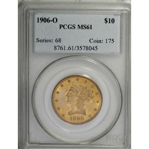 <B>1906-O $10 MS61 PCGS.</B></I> . PCGS Population (47/114). NGC Census: (58/105). Mintage: 86,895. Numismedia Wsl. Price for NGC/PCGS coin in MS61: $530. (#8761)<BR><BR><B>Coin Engraver:</B> Christian Gobrecht<BR><BR><b>Shipping:</b> Coins & Currency (<a target="_blank" href="http://www.heritageauctions.com/common/shipping.php">view shipping information</a>)
