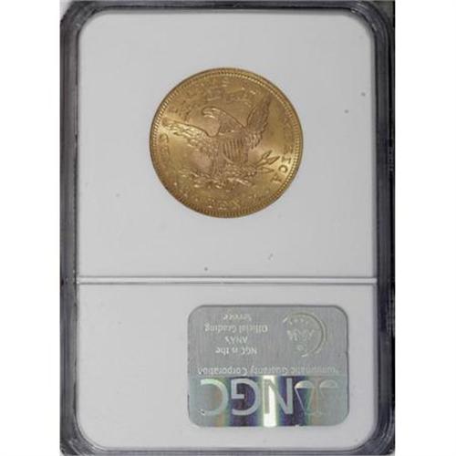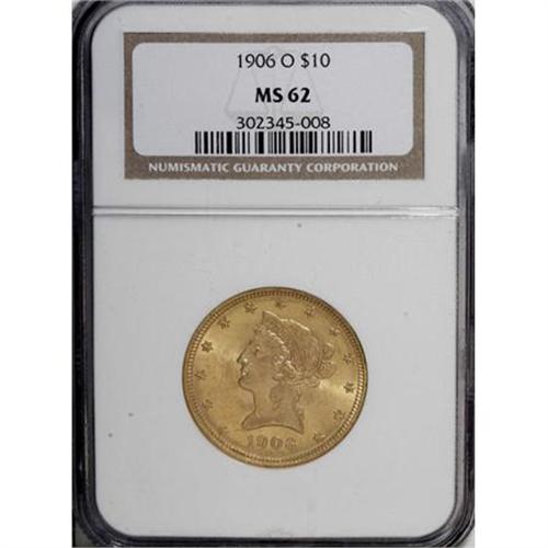 <B>1906-O $10 MS62 NGC.</B></I> This date was apparently not found to any great extent in European hoards, as Uncirculated examples are scarce (Jeff Garrett and Ron Guth, 2006). This MS62 specimen displays glowing luster emanating from orange-gold surfaces that yield sharply struck design elements. Census: 58 in 62, 42 finer (6/07).<BR><BR><b>Shipping:</b> Coins & Currency (<a target="_blank" href="http://www.heritageauctions.com/common/shipping.php">view shipping information</a>)