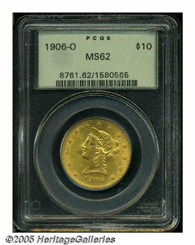 <B>1906-O<$10> MS62 PCGS.</B></I> A lustrous yellow-gold piece with an undisturbed reverse and only a few moderate marks near the chin and on the cheek. The 1906-O is noticeably scarcer than the other O-mint Tens of its decade. Population: 63 in 62, 42 finer (5/05).