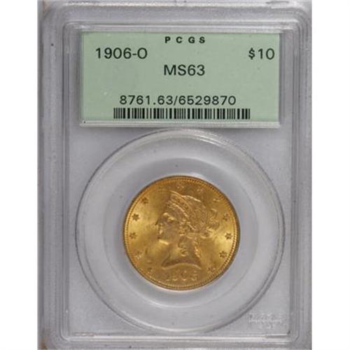 <B>1906-O $10 MS63 PCGS.</B></I> The low mintage 1906-O can be located with patience in AU58 to MS62 grades, but Select examples are rare. This boldly struck piece has pleasing luster and clean fields. A few subtle facial marks deny a higher grade. Certified in a green label holder. Population: 29 in 63, 15 finer (8/07).<BR><BR><B>Coin Engraver:</B> Christian Gobrecht<BR><BR><b>Shipping:</b> Coins & Currency (<a target="_blank" href="http://www.heritageauctions.com/common/shipping.php">view shipping information</a>)