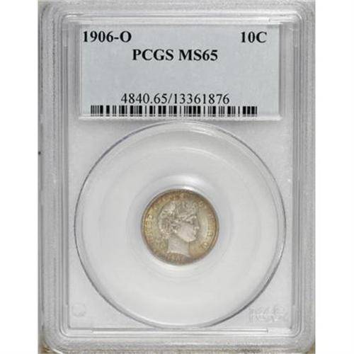 <B>1906-O 10C MS65 PCGS. CAC.</B></I> Glowing luster exudes from pastel multicolored surfaces. Well struck on the design features and minimally abraded. Light roller marks occur on Liberty's cheek. Population: 30 in 65, 19 finer (11/07).<BR><BR><B>Coin Engraver:</B> Charles E. Barber<BR><BR><b>Shipping:</b> Coins & Currency (<a target="_blank" href="http://www.heritageauctions.com/common/shipping.php">view shipping information</a>)