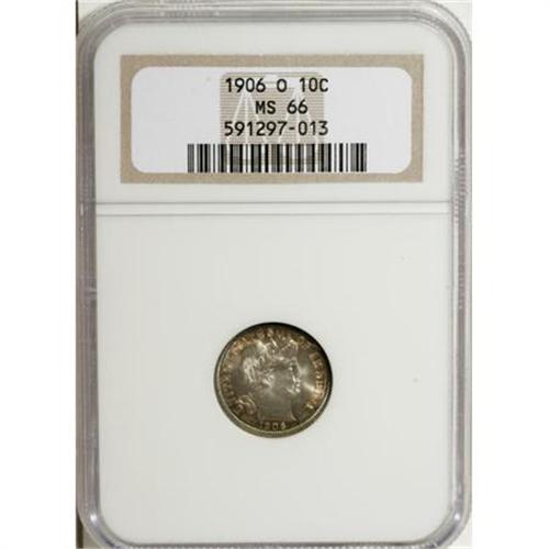 <B>1906-O 10C MS66 NGC.</B></I> Uncommonly well-defined for this New Orleans issue. On this satiny representative, deep russet peripheral patina frames untoned centers. Census: 13 in 66, 7 finer (8/07).<BR><BR><B>Coin Engraver:</B> Charles E. Barber<BR><BR><b>Shipping:</b> Coins & Currency (<a target="_blank" href="http://www.heritageauctions.com/common/shipping.php">view shipping information</a>)