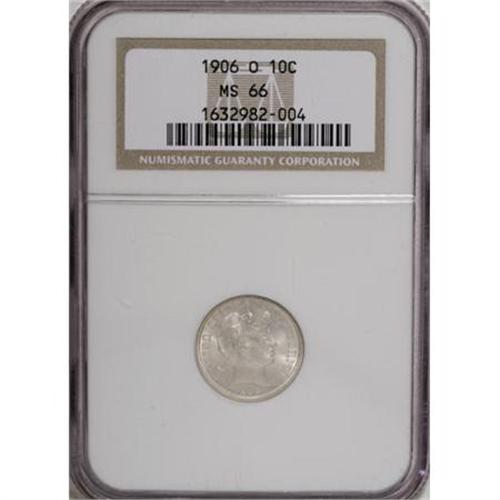 <B>1906-O 10C MS66 NGC.</B></I> Lustrous, well struck, and lightly toned. A lovely Premium Gem. Census: 13 in 66, 7 finer (1/08).<BR><I>From The Southwest Collection.</B></I><BR><BR><B>Coin Engraver:</B> Charles E. Barber<BR><BR><b>Shipping:</b> Coins & Currency (<a target="_blank" href="http://www.heritageauctions.com/common/shipping.php">view shipping information</a>)