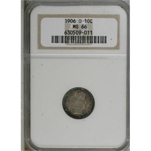 <B>1906-O 10C MS66 NGC.</B></I> A satiny and richly toned representative of this popular O-mint issue, well struck and beautifully preserved. Deep blue-green and periwinkle toning appears at the margins, while orange shadings grace the centers. Census: 13 in 66, 7 finer (2/08).<BR><BR><B>Coin Engraver:</B> Charles E. Barber<BR><BR><b>Shipping:</b> Coins & Currency (<a target="_blank" href="http://www.heritageauctions.com/common/shipping.php">view shipping information</a>)