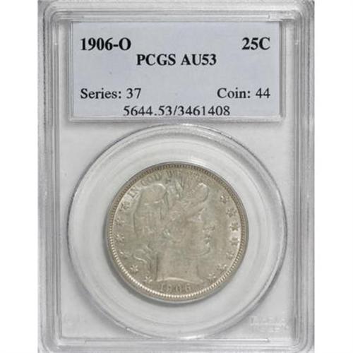 <B>1906-O 50C AU53 PCGS. Incorrectly certified as a Quarter by PCGS.</B></I> PCGS Population (2/71). NGC Census: (3/66). Mintage: 2,446,000. Numismedia Wsl. Price for NGC/PCGS coin in AU53: $317. (#6506)<BR><BR><B>Coin Engraver:</B> Charles E. Barber<BR><BR><b>Shipping:</b> Coins & Currency (<a target="_blank" href="http://www.heritageauctions.com/common/shipping.php">view shipping information</a>)