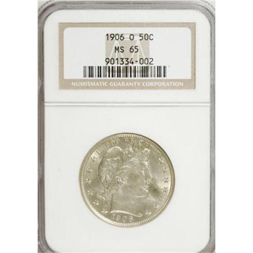 <B>1906-O 50C MS65 NGC.</B></I> The 1906-O is among the more often encountered O-mint Barber halves, and many pieces show nice surfaces and luster, with a typically poor strike. This example shows lustrous silver-orange surfaces with good luster and generous eye appeal. The strike is typical on the reverse, but fairly bold on the obverse, and there are no singular abrasions. NGC has certified only 10 Gems, with four pieces finer (1/08).<BR><I>From The Southwest Collection.</B></I><BR><BR><B>Coin Engraver:</B> Charles E. Barber<BR><BR><b>Shipping:</b> Coins & Currency (<a target="_blank" href="http://www.heritageauctions.com/common/shipping.php">view shipping information</a>)