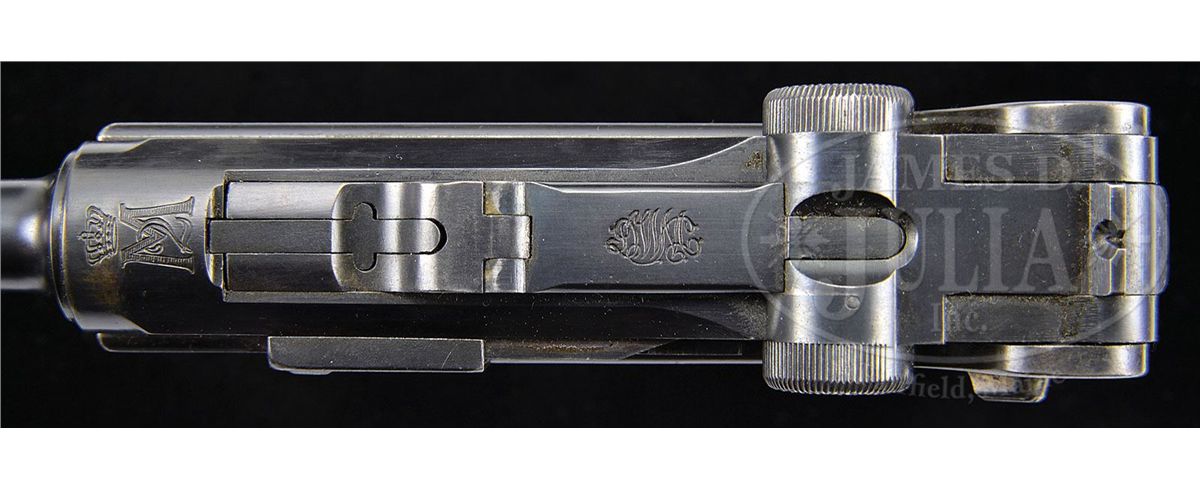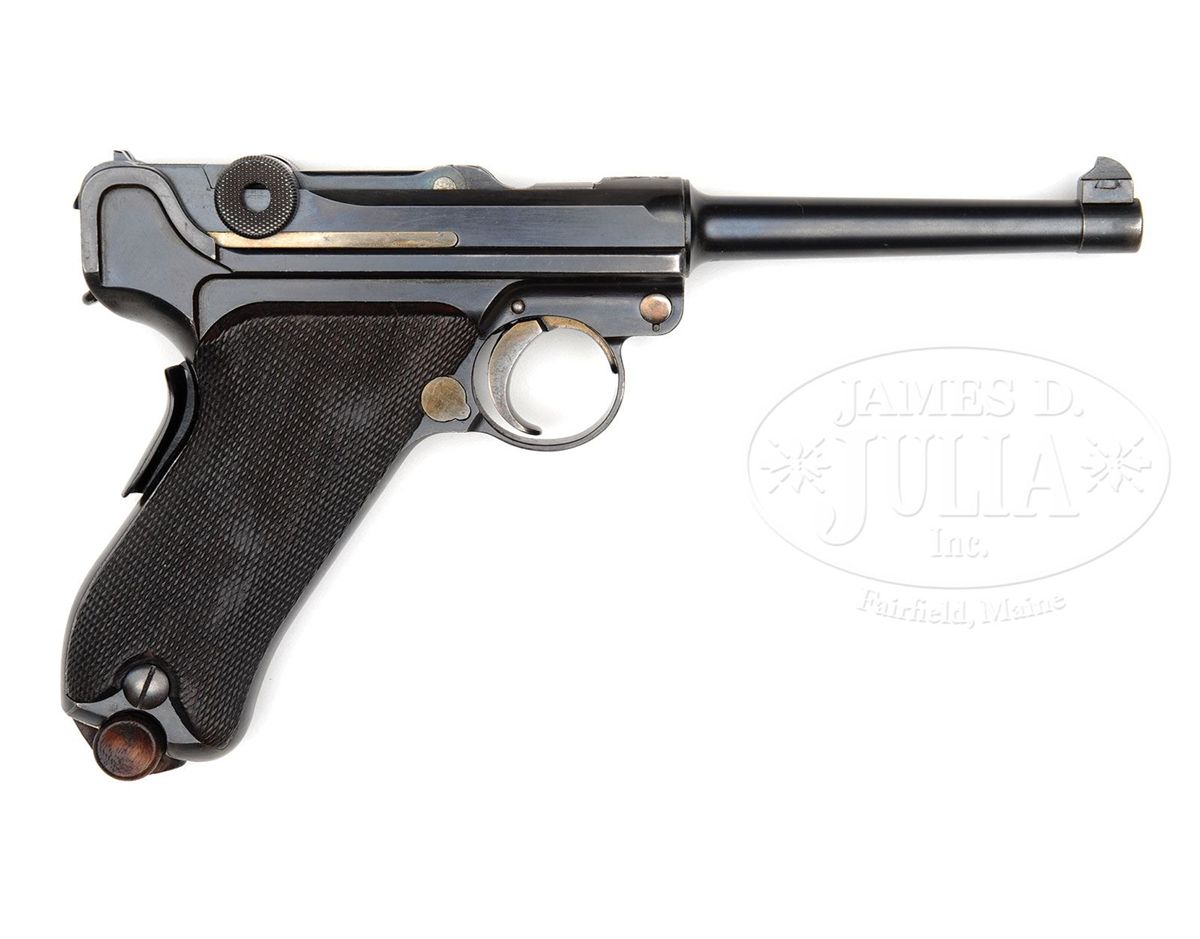 SN 3279. 4-3/4" 30 Cal. bbl. "M2" crest above chamber. "DWM" scroll on center toggle link. Portuguese triangle in circle inspection/acceptance mark on receiver, bbl, and original wood bottom magazine. Grip safety. Checkered walnut grips. All numbered parts are matching. This gun is featured on pp. 570, 606 and 678 of Dr. Geoffrey Sturgess' The Borchardt & Luger Automatic Pistols. PROVENANCE: Collection of Dr. Geoffrey Sturgess. CONDITION: Excellent retaining 97% original blue and 80% original straw. Bore is sharp with very light frosting. Grips are moderately worn with indentations. Magazine is excellent with some very minor corrosion to the body. Mechanics are sound. 4-52862 BWS63