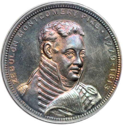 1906 Pike's Peak Centennial, Southwest Expedition Medal, SC$1 HK-335 PROOF. PCGS MS-65. PCGS graded MS-65 Mint State issue has oxidized gray finish. This example is brilliant silver, with prooflike surfaces under toning. Silver. 34 mm. An exceptional example of this medal that marks the centennial of Zebulon Pike's Southwest Expedition, and the discovery of the mountain that now bears his name. The obverse displays the bust of Pike, and the reverse depicts Pike's Peak. Designed by C.E. Barber and struck at Philadelphia Mint. Brilliant surfaces prooflike surfaces under deep blue, gray and gold toning and visibly frosty devices. Only 250 proofs are known to have been struck, and it is believed that there are less than 75 surviving specimens. NGC census shows four graded Proof-65 and one Proof-65 Cameo with none finer.