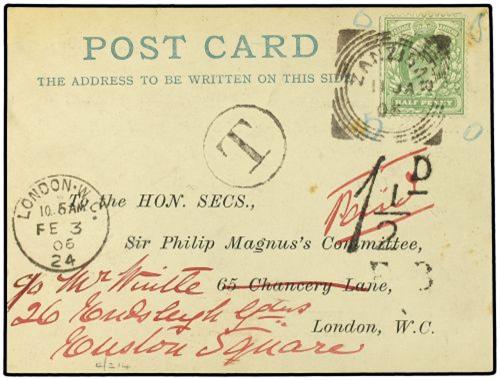 1906 Pre-paid Post card from the Parliamentry Election in London for suport of Sir Philip Magnus, returned by J. Hine, Mkunazine, Zanzibar bearing Great Britain 1/2 d yellow green (SG 217) tied by ZANZIBAR squared circle, invalid with circular TAX handstamp and charged 1 1/2 d on arrival in London, delated with manuscript "Paid". Unusual item.