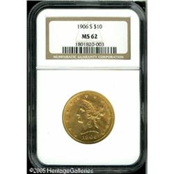 <B>1906-S $10 MS62 NGC.</B></I> A fully struck and intensely lustrous example of this scarcer, late-date ten dollar Liberty. Population: 34 in 62, 11 finer (1/05). Lot:8838