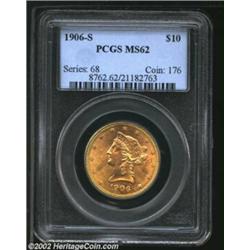 1906-S $10 MS62 PCGS. Even though half a million pieces were struck of this issue, it is seldom seen in mint condition. This is a sharply struck, lustrous piece that has a few field marks and one unfortunate abrasion across the top of Liberty's hair. Important notice: We expect to be auctioning lots at the rate of 200-250 per hour. Sometimes eBay Premier live bid software cannot keep up with that pace, so we strongly recommend that you place a realistic proxy bid now as insurance to avoid disappointment. Also please note that all Heritage/CAA lots purchased through eBay Premier carry a 20% Buyer's Premium. Please make sure you read the Terms and Conditions.