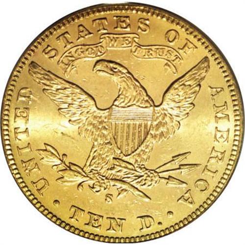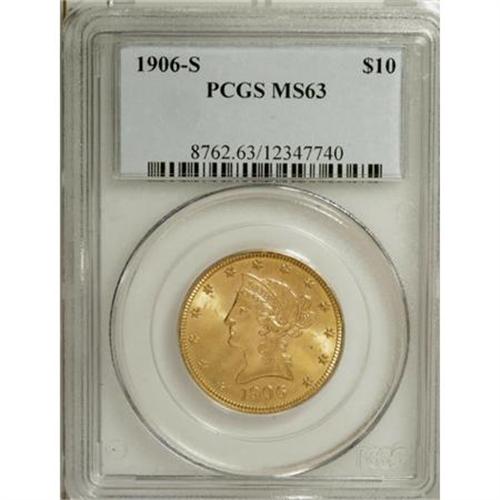 <B>1906-S $10 MS63 PCGS.</B></I> This issue can be located in About Uncirculated to MS61 grades with a little searching and patience, but MS62 and finer coins are challenging. This Select example displays pleasing luster exuding from peach-gold surfaces. A well executed strike imparts virtually complete definition to the design elements. A few minor marks keep it from a higher grade. Population: 21 in 63, 8 finer (3/08).<BR><BR><B>Coin Engraver:</B> Christian Gobrecht<BR><BR><b>Shipping:</b> Coins & Currency (<a target="_blank" href="http://www.heritageauctions.com/common/shipping.php">view shipping information</a>)