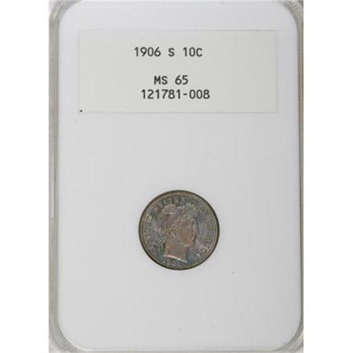 <B>1906-S 10C MS65 NGC.</B></I> Sharply struck with strong, shining luster beneath rich blue-green and violet patina. Wonderful eye appeal with just a few minuscule flaws in inoffensive areas. Housed in an early-generation NGC holder. Census: 15 in 65, 10 finer (11/07).<BR><BR><B>Coin Engraver:</B> Charles E. Barber<BR><BR><b>Shipping:</b> Coins & Currency (<a target="_blank" href="http://www.heritageauctions.com/common/shipping.php">view shipping information</a>)