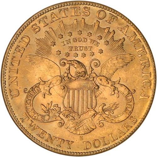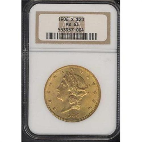 <b>1906-S $20 Liberty. NGC graded MS63.</b> The otherwise pale orange-gold color yields to warmer golden-rose hues in areas <b>(PCGS # 9051)</b> <i>
