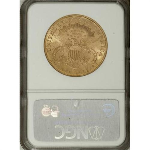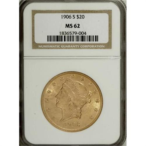 <B>1906-S $20 MS62 NGC.</B></I> NGC Census: (1390/647). PCGS Population (1294/1100). Mintage: 2,065,750. Numismedia Wsl. Price for NGC/PCGS coin in MS62: $775. (#9051)<BR><BR><B>Coin Engraver:</B> James B. Longacre<BR><BR><b>Shipping:</b> Coins & Currency (<a target="_blank" href="http://www.heritageauctions.com/common/shipping.php">view shipping information</a>\)
