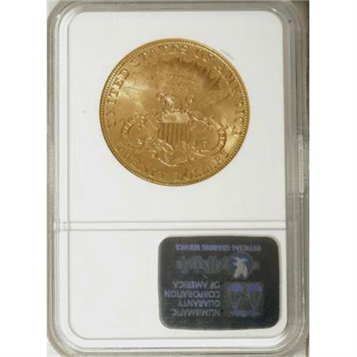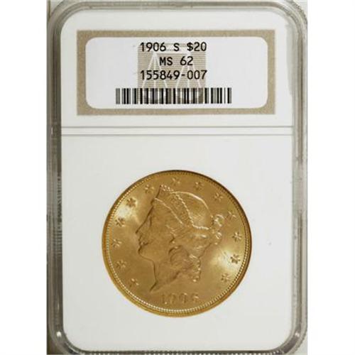 <B>1906-S $20 MS62 NGC.</B></I> NGC Census: (1453/671). PCGS Population (1392/1169). Mintage: 2,065,750. Numismedia Wsl. Price for NGC/PCGS coin in MS62: $935. (#9051)<BR><BR><B>Coin Engraver:</B> James B. Longacre<BR><BR><b>Shipping:</b> Coins & Currency (<a target="_blank" href="http://www.heritageauctions.com/common/shipping.php">view shipping information</a>)