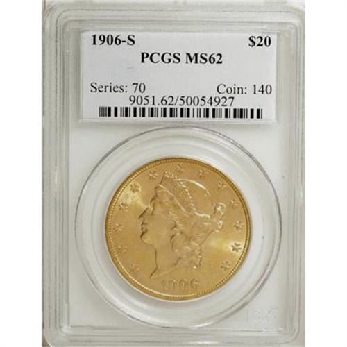 <B>1906-S $20 MS62 PCGS.</B></I> PCGS Population (1392/1169). NGC Census: (1453/671). Mintage: 2,065,750. Numismedia Wsl. Price for NGC/PCGS coin in MS62: $935. (#9051)<BR><BR><B>Coin Engraver:</B> James B. Longacre<BR><BR><b>Shipping:</b> Coins & Currency (<a target="_blank" href="http://www.heritageauctions.com/common/shipping.php">view shipping information</a>)