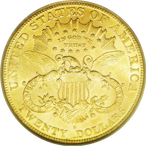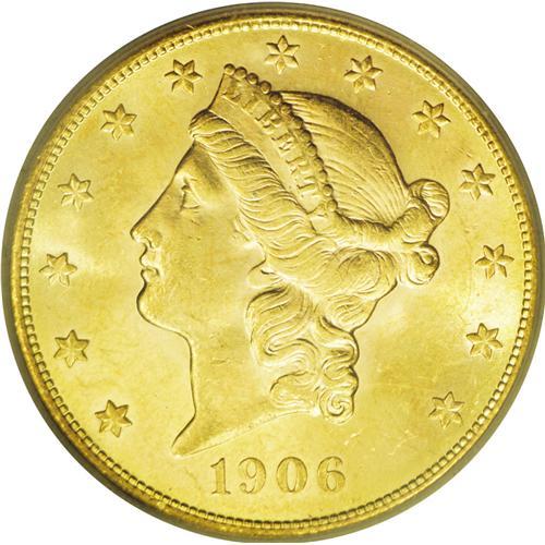 <B>1906-S<$20> MS63 ICG.</B></I> The 1906-S double eagle is obtainable in the lower Uncirculated grades, through MS63. It becomes scarce in near-Gem, and is a rarity in higher levels of preservation. This MS63 specimen is awash with yellow and apricot-gold luster, and reveals bold execution on the design elements. The grade would rate higher were it not for light bag marks on Liberty's face and neck.
