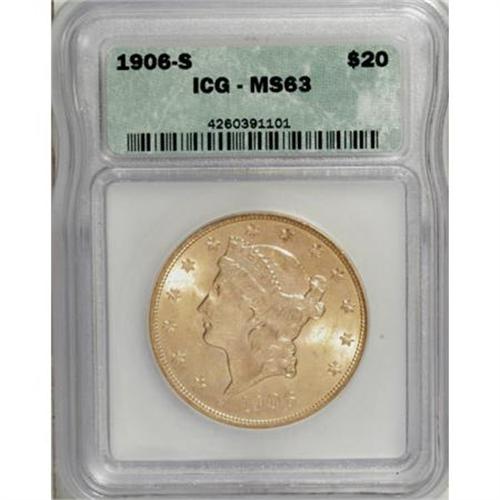 <B>1906-S $20 MS63 ICG.</B></I> Typically lustrous with pleasing reddish-golden color throughout. The fortress known as the San Francisco mint was one of the few buildings to survive unscathed by the great earthquake of 1906.<BR><BR><B>Coin Engraver:</B> James B. Longacre<BR><BR><b>Shipping:</b> Coins & Currency (<a target="_blank" href="http://www.heritageauctions.com/common/shipping.php">view shipping information</a>\)