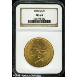 <B>1906-S $20 MS63 NGC.</B></I> A nice, Select Mint State example with bright luster, perfect for a Mint State gold type set. A couple of abrasions are noted in the left obverse field.<BR><I>From The Richard J. Chouinard Collection of United States Coins, Part Two.</B></I> Lot:9414