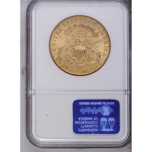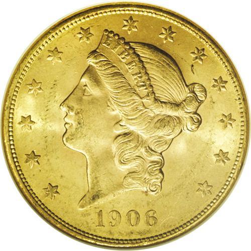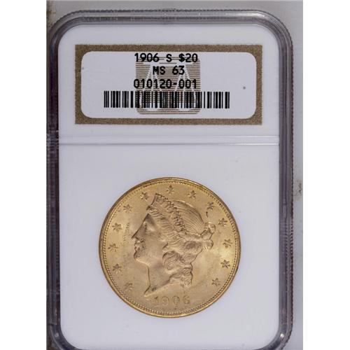 <B>1906-S<$20> MS63 NGC.</B></I> Bowers' double eagle reference calls this issue scarce in MS64 and rare any finer. This specimen shows pretty apricot-gold surfaces that are brilliant and lustrous, especially on the choice reverse. A few luster grazes in the obverse fields on each side of the portrait are noted. The peripheral strike on the obverse stars is soft.
