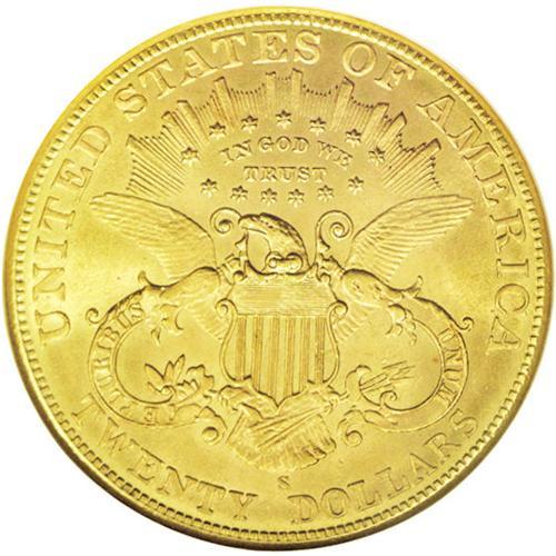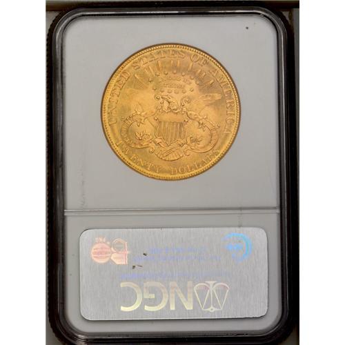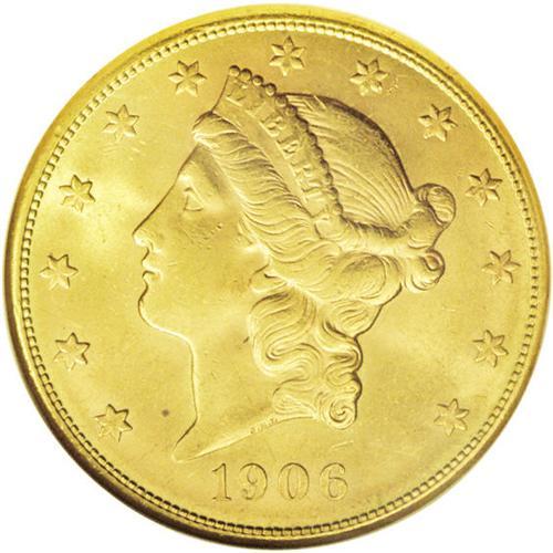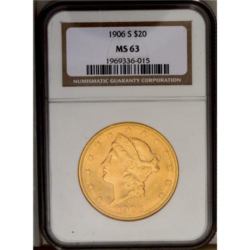 <B>1906-S<$20> MS63 NGC.</B></I> This pristine example shows a notable lack of abrasions save for a curious pair of parallel ticks at the top of Liberty's head, just behind the coronet. The highpoint hair is fairly softly struck and lacks detail in that area, as do some of the star centrils. The luster is pleasing, if a touch muted, and the color is a pretty orange-gold.