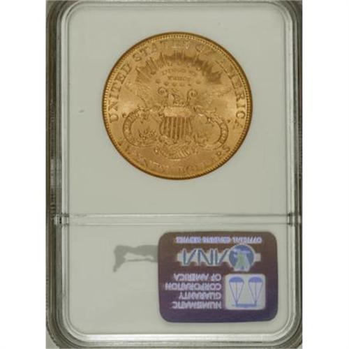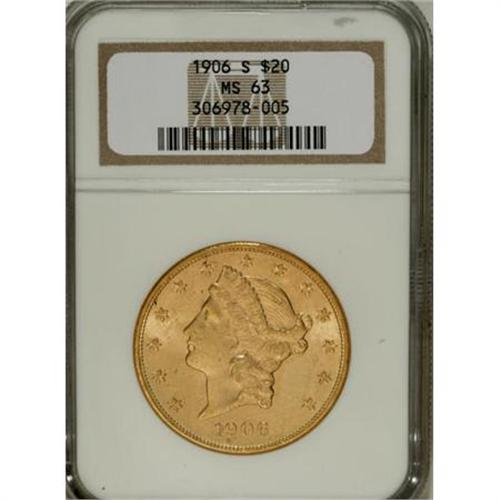 <B>1906-S $20 MS63 NGC.</B></I> The strike is crisp on this late-date S-mint Liberty twenty, and the yellow-gold fields offer undimmed luster. Attractive for the grade assigned, though wispy abrasions appear on the hazy surfaces.<BR><BR><B>Coin Engraver:</B> James B. Longacre<BR><BR><b>Shipping:</b> Coins & Currency (<a target="_blank" href="http://www.heritageauctions.com/common/shipping.php">view shipping information</a>)