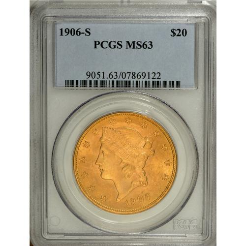 <B>1906-S $20 MS63 PCGS.</B></I> A lustrous honey-gold example with scattered abrasions that befit the grade.<BR><BR><b>Shipping:</b> Coin/Currency (<a target="_blank" href="http://www.heritageauctions.com/common/shipping.php">view shipping information</a>)